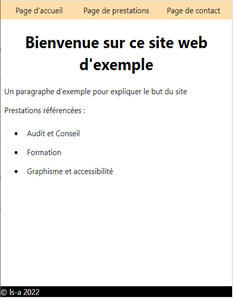 { "navigation": [ { "titre": "Page d'accueil", "page": "https://ls-a.fr/" }, { "titre": "Page de prestations", "page": "https://ls-a.fr/prestations" }, { "titre": "Page de contact", "page": "https://ls-a.fr/contact" } ], "titre": "Bienvenue sur ce site web d'exemple", "sous-titre": "Un paragraphe d'exemple pour expliquer le but du site", "prestations": "Prestations référencées", "liste-prestations": [ "Audit et Conseil", "Formation", "Graphisme et accessibilité" ] }{ "navigation": [ { "titre": "Page d'accueil", "page": "https://ls-a.fr/" }, { "titre": "Page de prestations", "page": "https://ls-a.fr/prestations" }, { "titre": "Page de contact", "page": "https://ls-a.fr/contact" } ], "titre": "Bienvenue sur ce site web d'exemple", "sous-titre": "Un paragraphe d'exemple pour expliquer le but du site", "prestations": "Prestations référencées", "liste-prestations": [ "Audit et Conseil", "Formation", "Graphisme et accessibilité" ] }Si nous avons réussi à piquer votre curiosité et que vous souhaitez découvrir d'autres fiches thématiques :