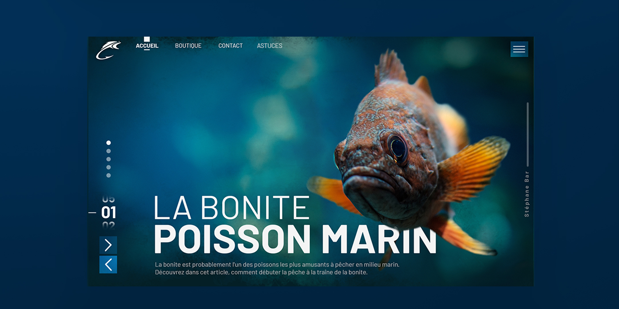 Nous avons créé un logo accrochant et élancé, mi-poisson mi-hameçon, ainsi que la maquette du site internet : la page d'accueil met à l'honneur le dernier article publié dans la catégorie Astuces , pour permettre aux pêcheurs de choisir les bons appâts pour leur pratique.