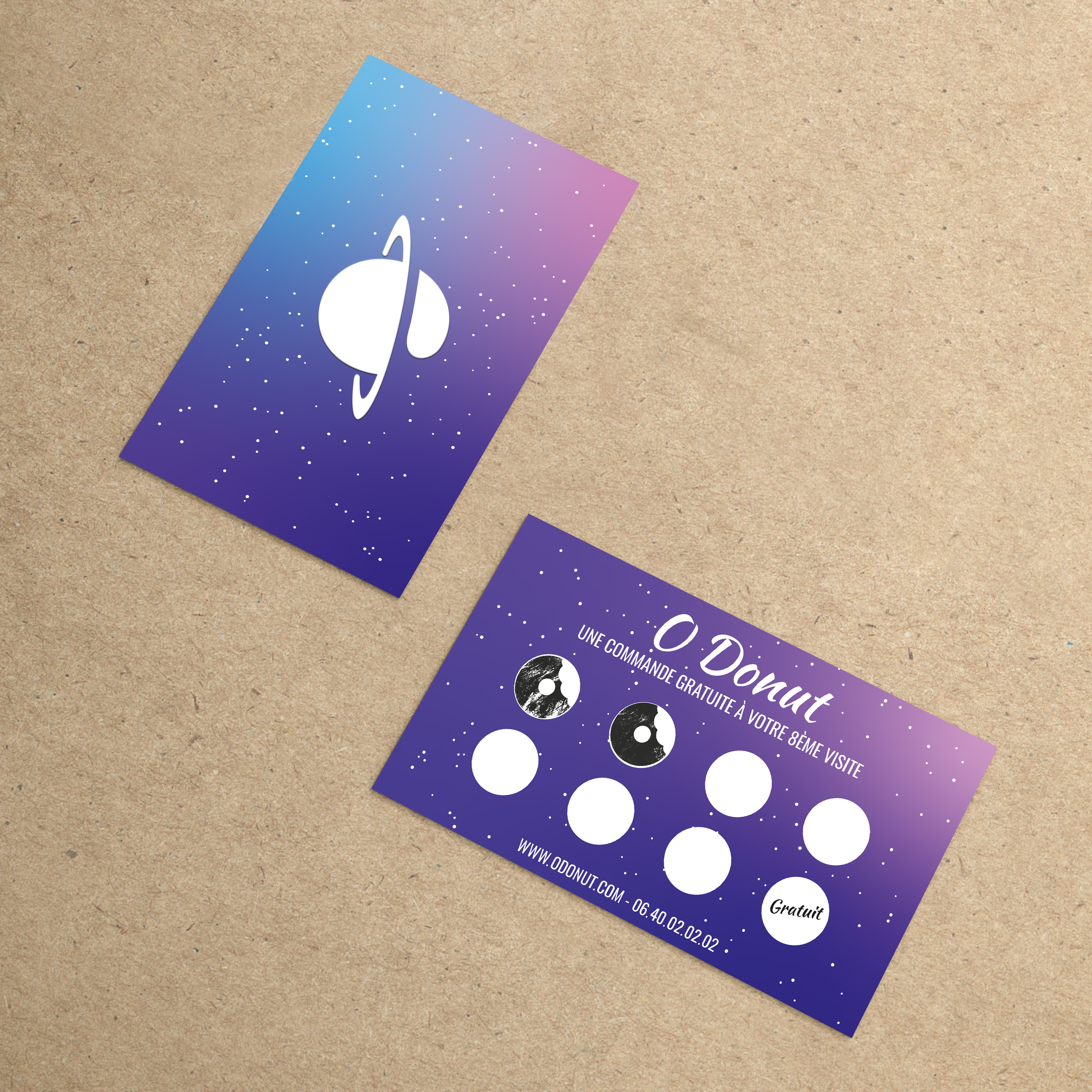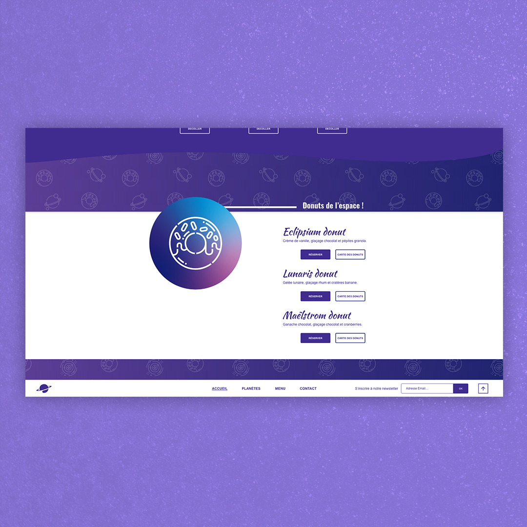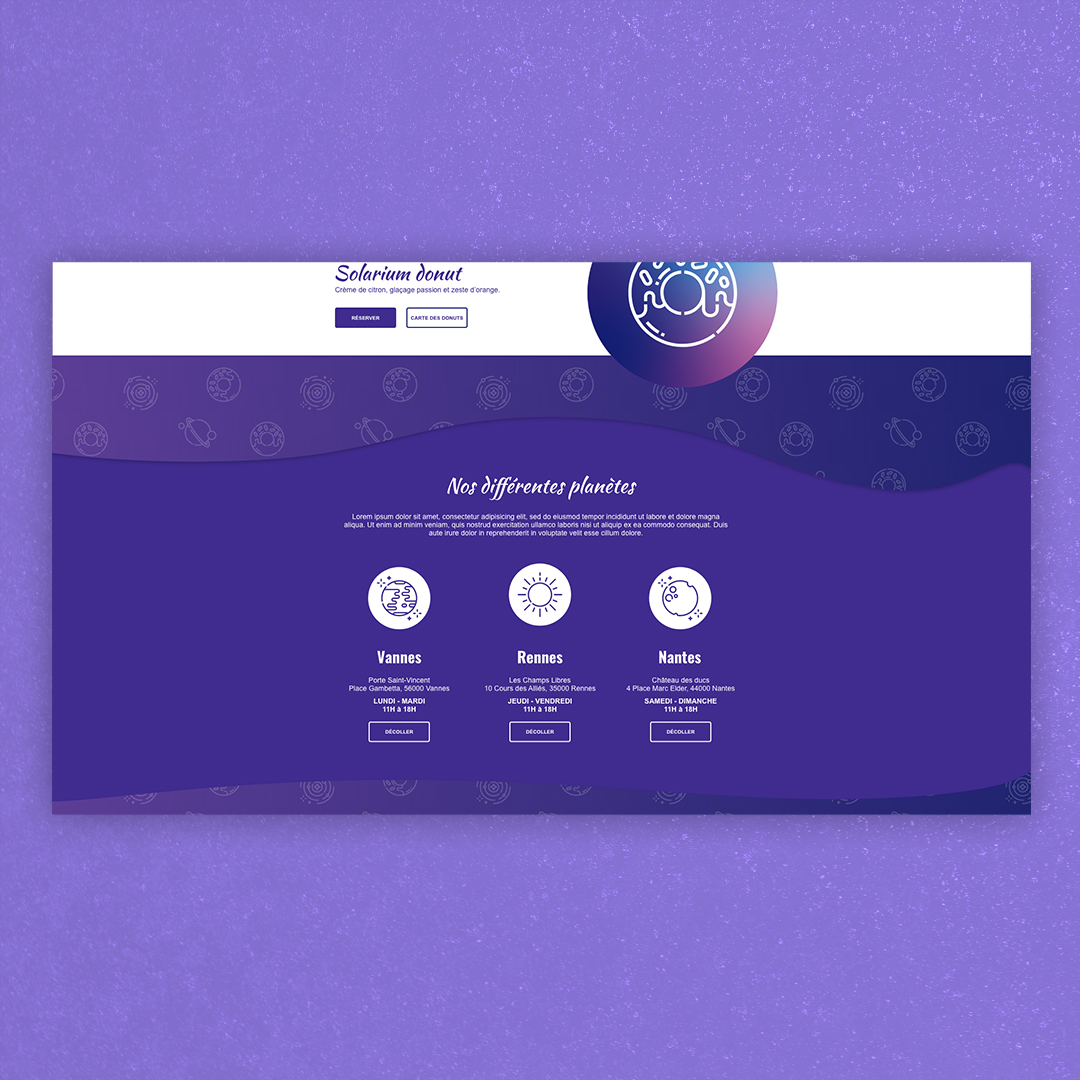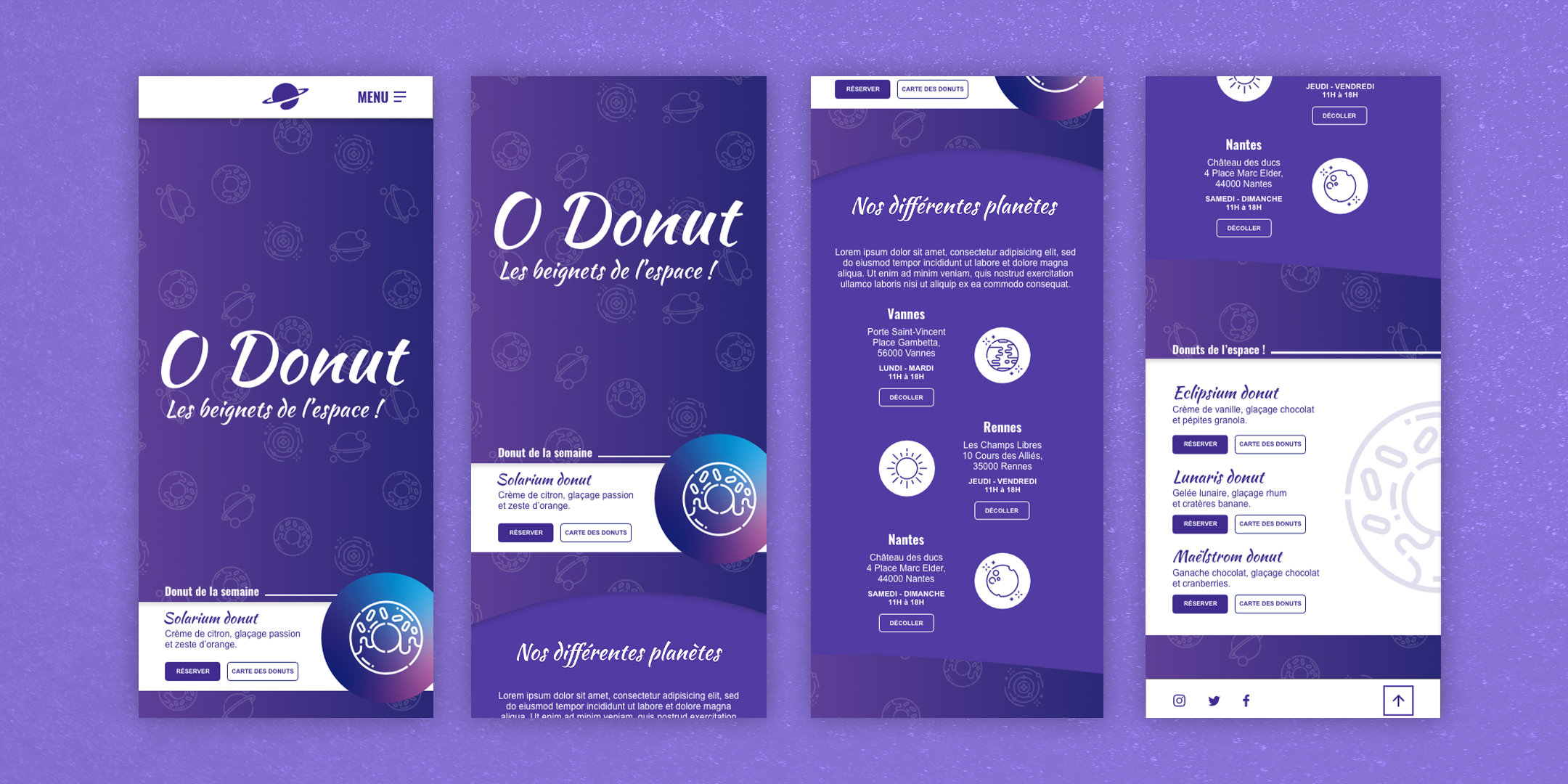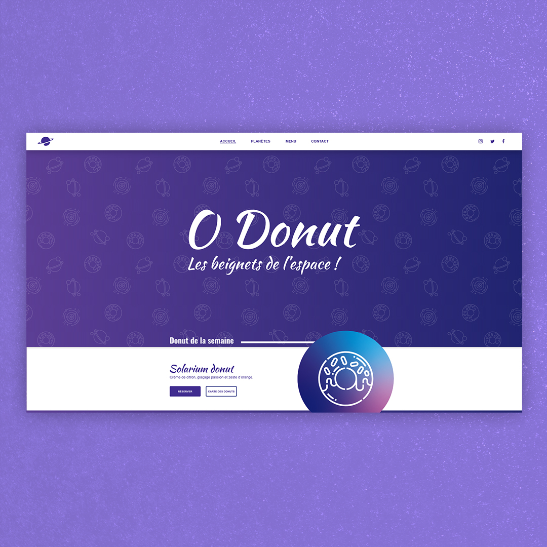 Pour cette brasserie itinérante, nous avons réalisé le logo et la maquette du site internet. Le logotype représente un donut bleu teinté de rose, dont le trou est formé par une planète ; ses couleurs pétillantes sont inspirées des décorations caractéristiques des pâtisseries de la marque, et invitent les gourmands à croquer dedans ! Le site quant à lui a pour mission principale d'informer les clients des lieux et horaires d'ouverture d'O Donut.