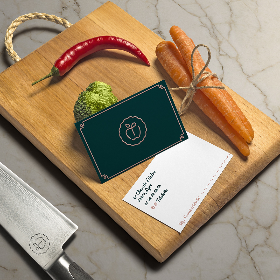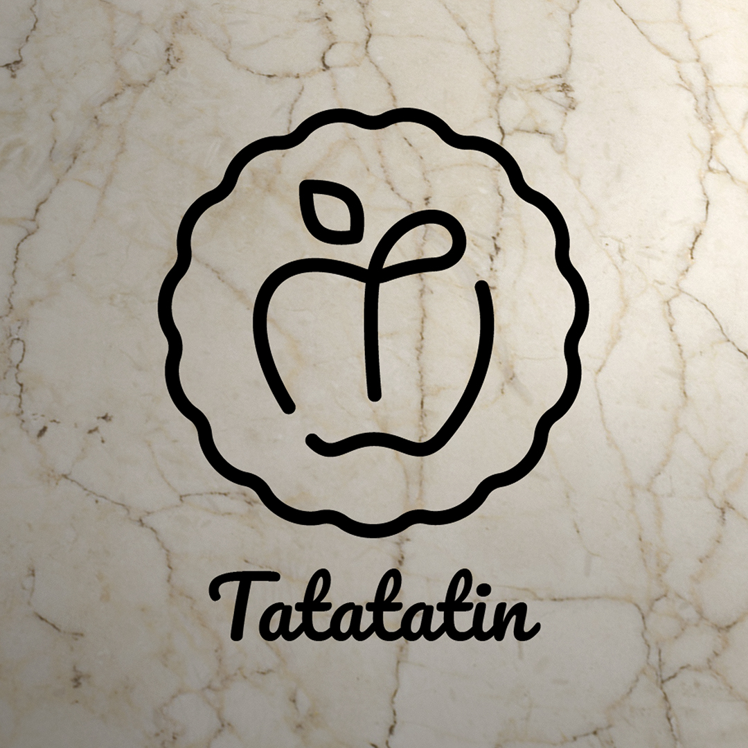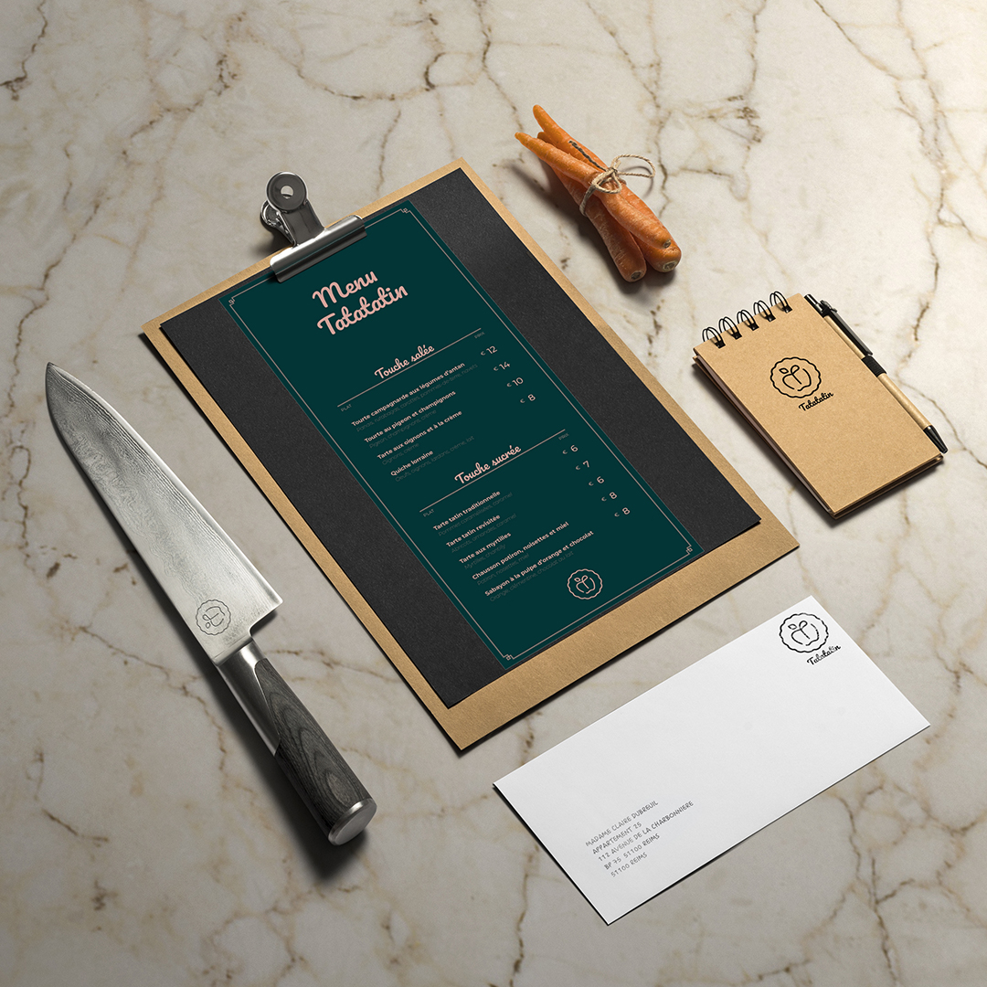 Le logo représente les contours d'un moule à tarte avec une pomme au milieu. Ses lignes très douces, associées à sa couleur vieux rose, lui confèrent un aspect à la fois authentique et moderne. Le menu et les cartes de visites sont sobres et élégants, et donnent envie de découvrir toutes les saveurs que Tatatatin a à offrir.