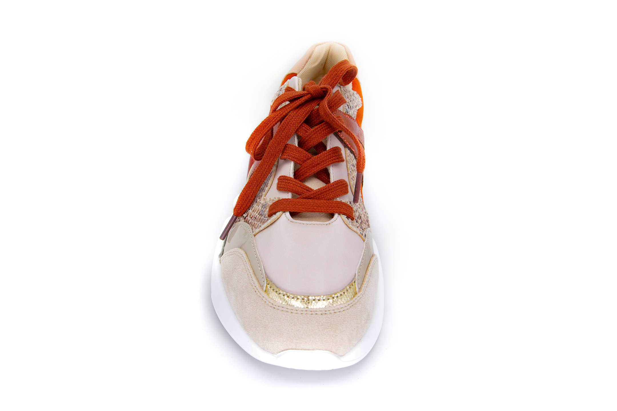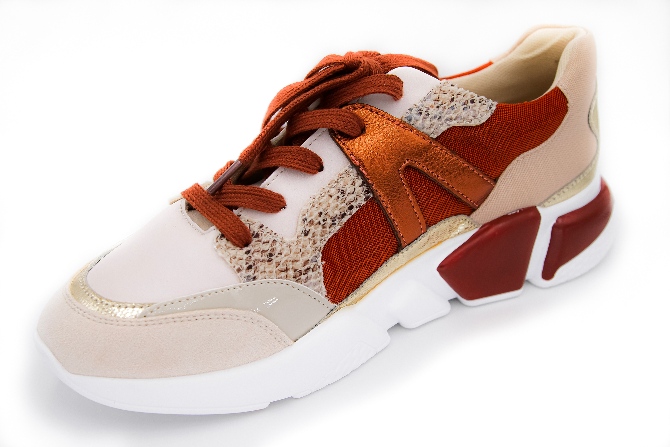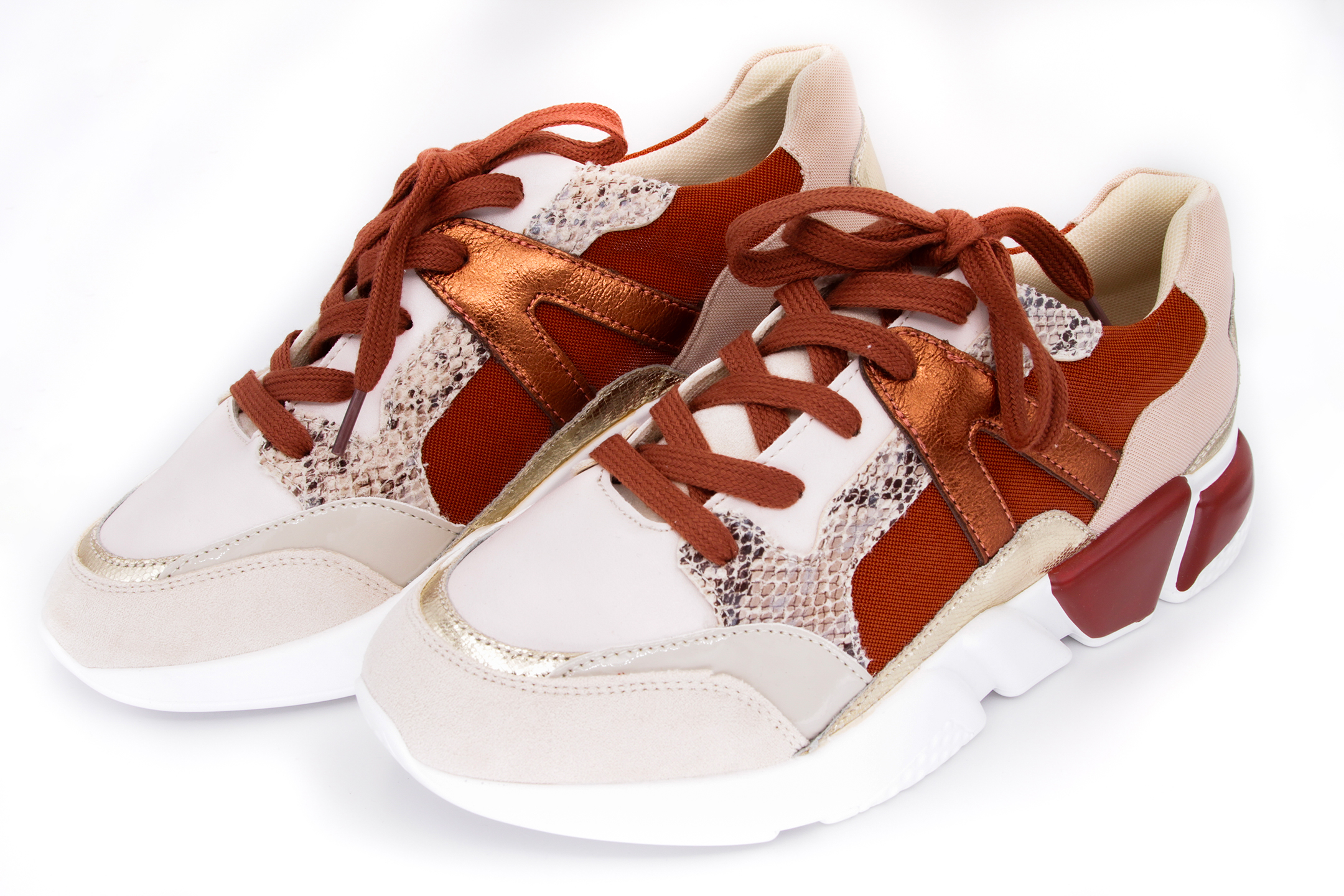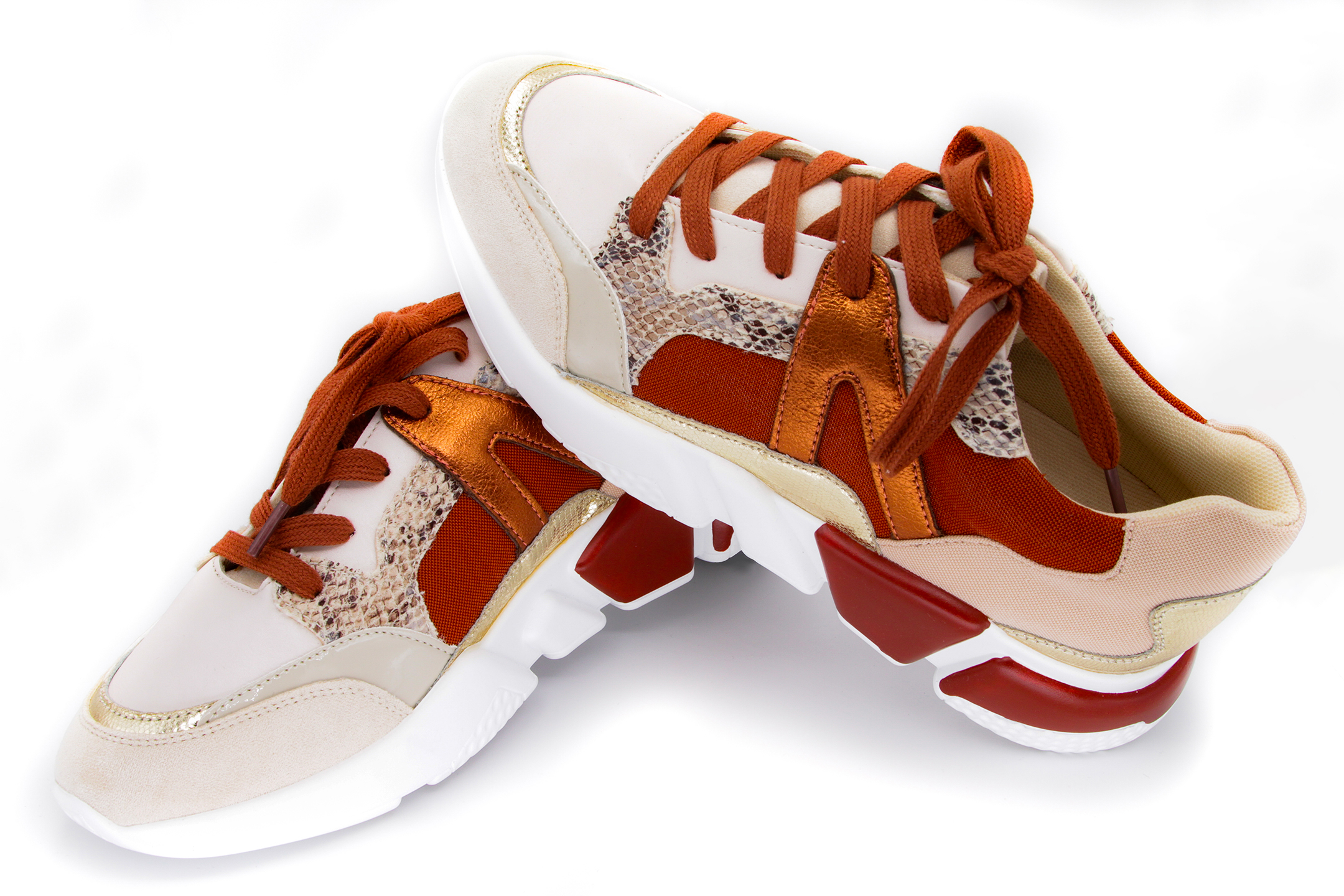 Nous avons réalisé une série de photos packshot du modèle de baskets « brique et beige à semelle graphique ».
